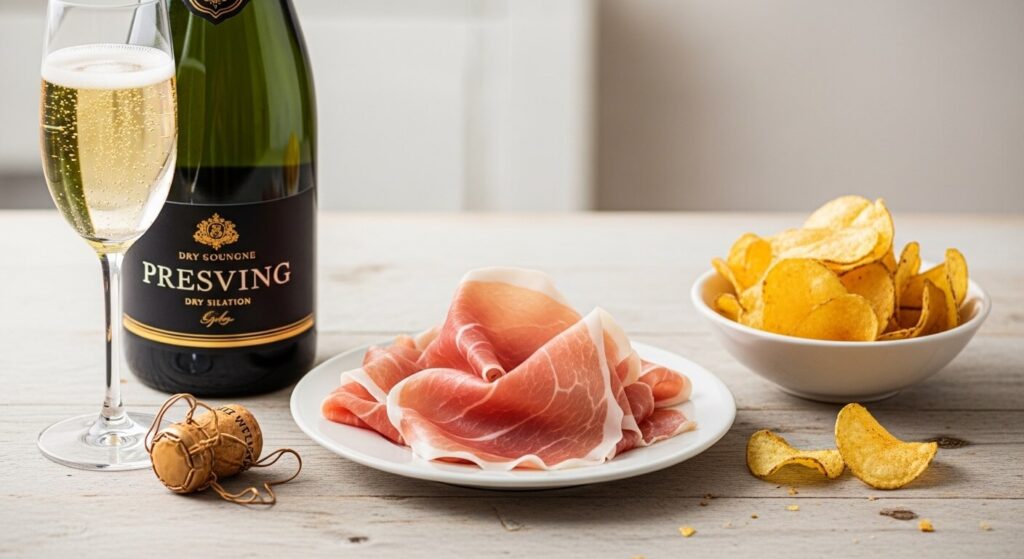 塩気とほんのりとした旨味がシャンパンの酸味と見事にリンクします。セブン-イレブンの「生ハム盛り合わせ」は薄切りで食べやすく、一枚ずつグラスのそばで食べると香りが広がります。「塩×酸」の黄金ペアリングです。