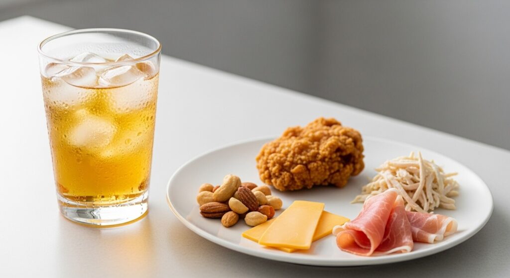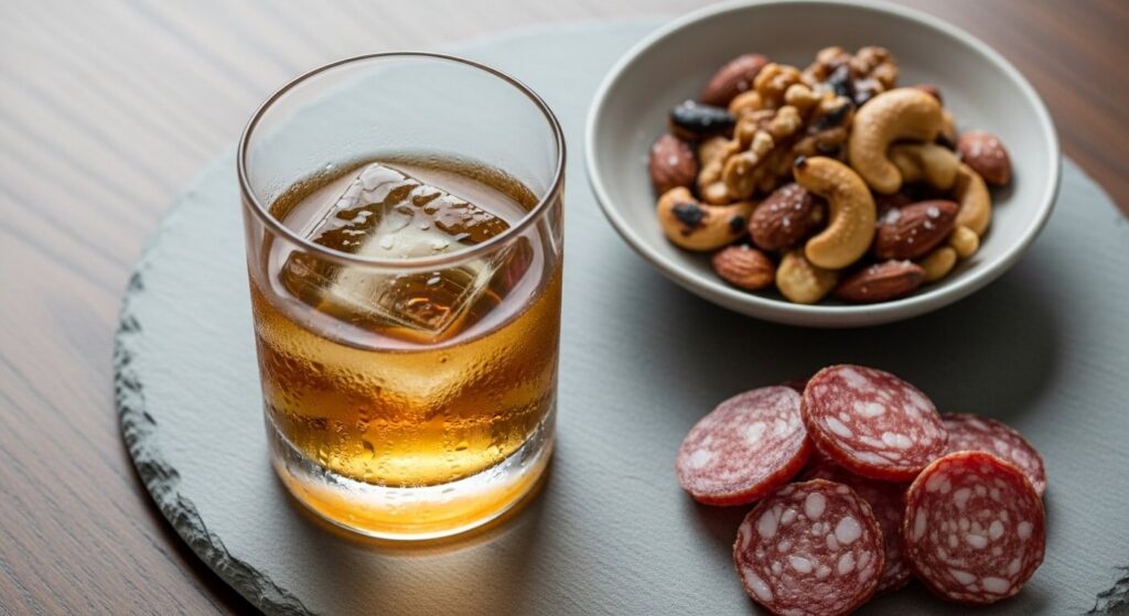 - スモーキー系ハイボール → 生ハム・スモークチーズ・素焼きナッツ
